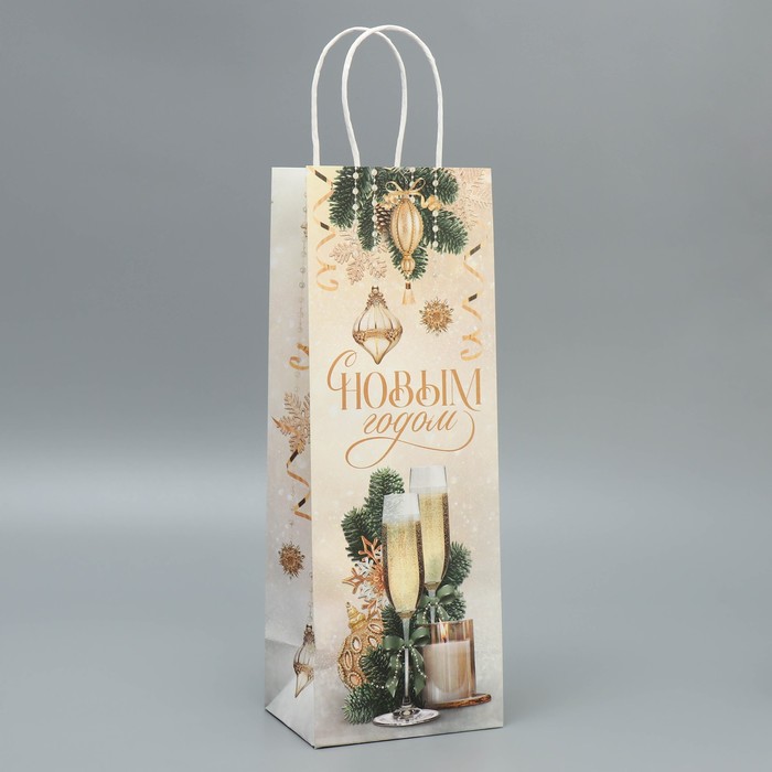Пакет подарочный новогодний под бутылку, упаковка "С Новым годом!", 14 х 8 х 32 см.