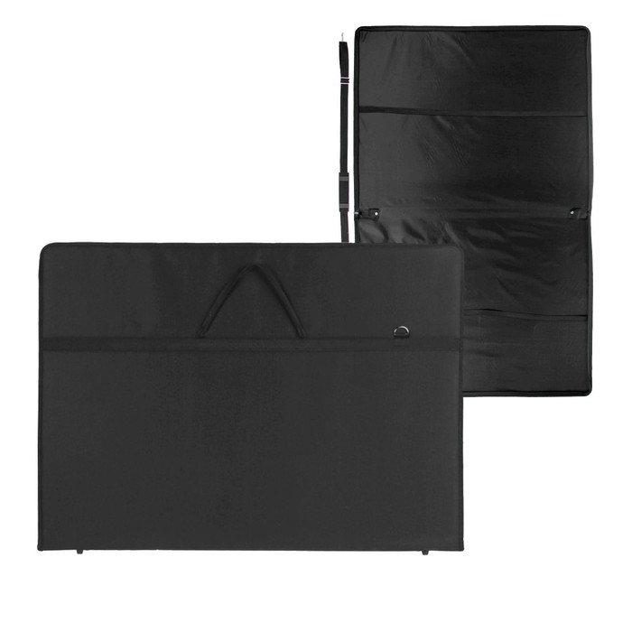 Папка - сумка А1, предназначена для переноски и хранения альбомов, планшетов, отдельных листов и завершенных работ на бумаге. Внутри папки эластичная отстегивающаяся лента для фиксации листов. По периметру папка застегивается на широкую молнию. Для удобства переноски имеется две ручки и наплечный ремень. В отдельных моделях предусмотрен наружный карман на молнии для кистей и других предметов для творчества.
