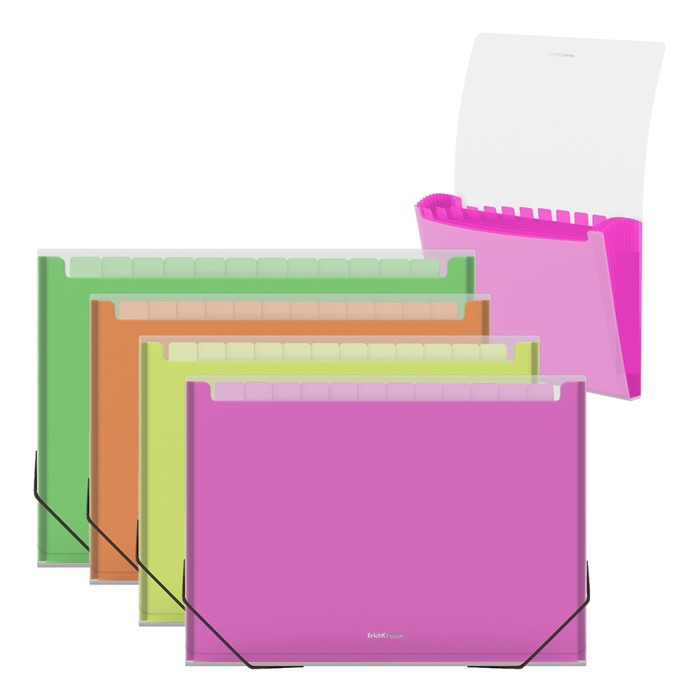 Папка-картотека с 13 отделениями формата А4 из высококачественного пластика с текстурой поверхности "песок", на которой не видно отпечатков пальцев и мелких царапин. Предназначена для хранения, систематизации и транспортировки документов. Цвет папки - прозрачный, цвет отделений - ассорти: желтый, зеленый, оранжевый, розовый. Эластичные резинки надежно удерживают папку в закрытом состоянии. Размер - 330х240х28мм, толщина - 0.55мм. Код и баркод на каждой единице товара.
