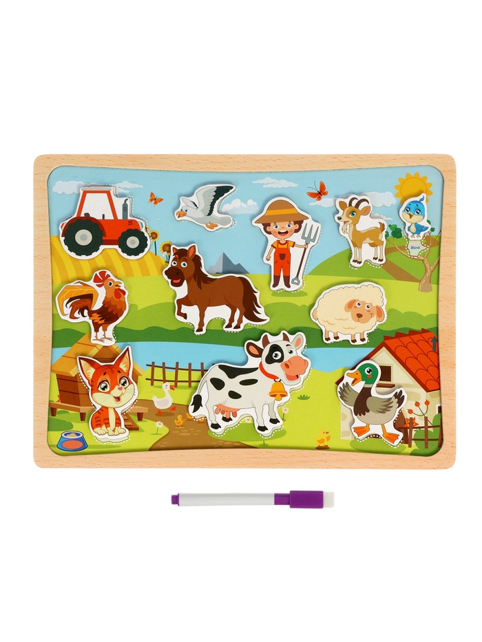 Двусторонний планшет «Ферма» — это универсальный набор для творчества и развития детей от 3 лет. С одной стороны — поверхность для рисования с маркером, а с другой — пазлы с фигурками животных на липучках, которые можно переставлять и создавать свои истории.