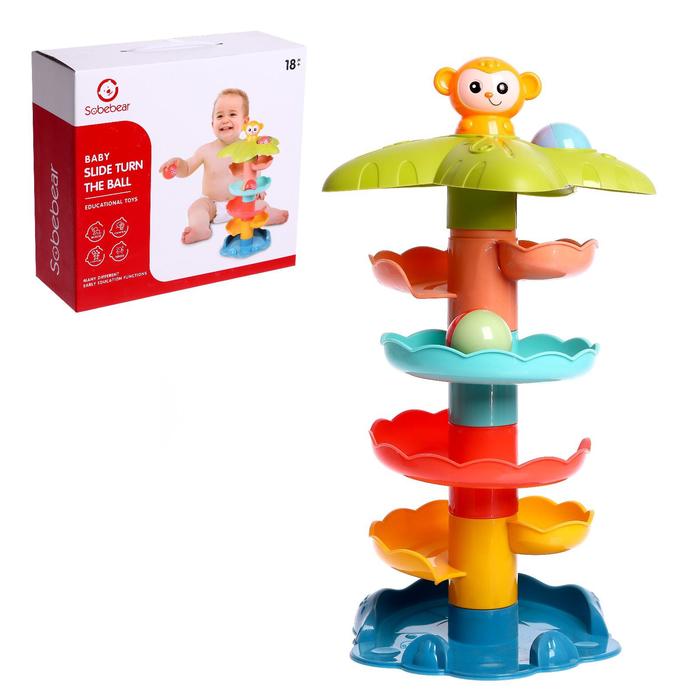 Малыш будет скатывать разноцветные шарики с горки по спирали и следить за ними.