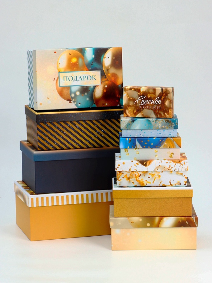 В набор входят десять коробок разного размера, начиная от самой большой 32,5 х 20 х 12,5 см и заканчивая самой маленькой 12 х 7 х 4 см. Это позволяет подобрать идеальную упаковку для любого подарка, независимо от его формы и размера.