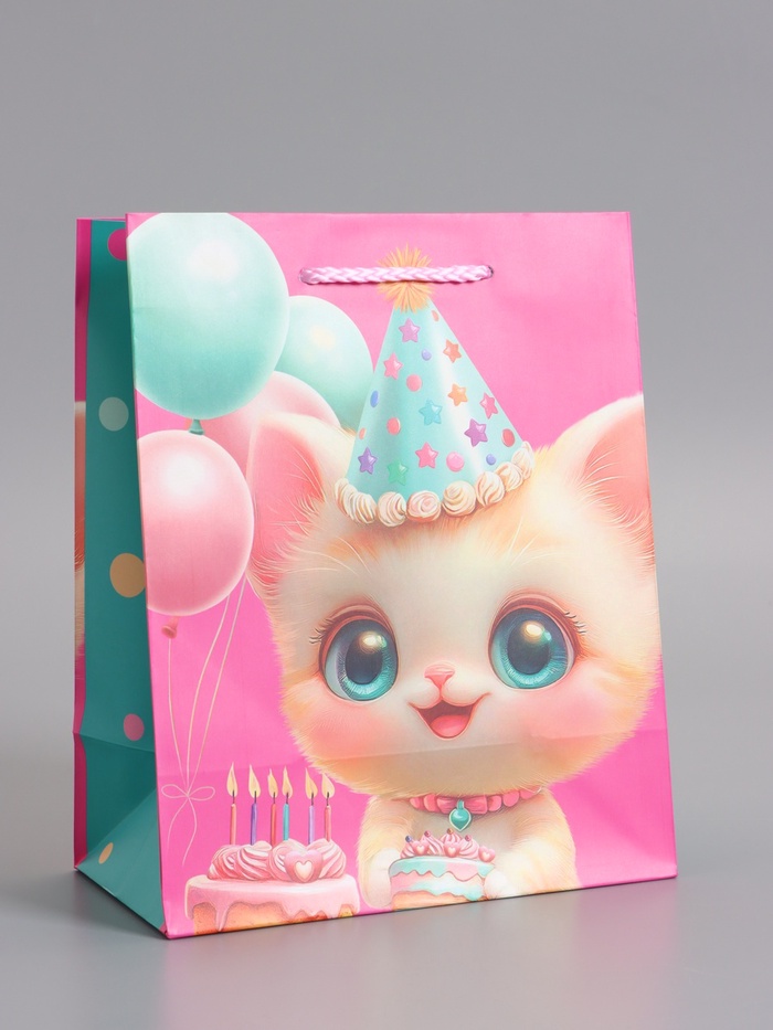 Праздничный розовый с днём рождения! Ламинированный подарочный пакет «С днём рождения!» — это упаковка формата M (18×22,3×10 см) с ярким дизайном: забавные зверята, воздушные шары, горошек и праздничная надпись. Шнуровые ручки, декоративные элементы, плотность картона 180 г/м², ламинация защищает от влаги.