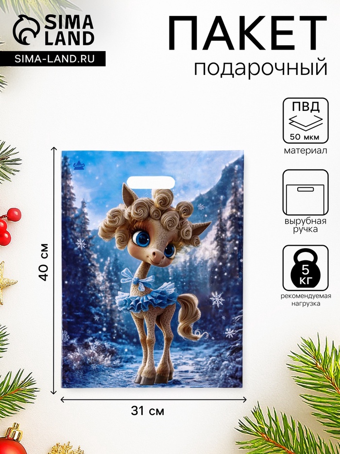Новогодний подарок в стильном оформлении! Праздничный пакет с символом года — элегантное решение для упаковки новогодних презентов. Голубой дизайн с изображением лошади создает атмосферу праздника, а усиленная конструкция гарантирует надежность.