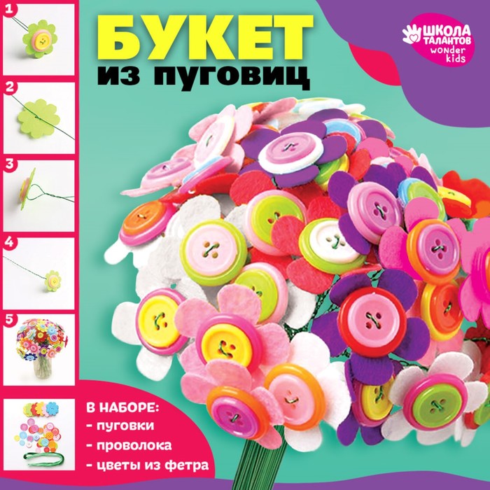 В набор входят фетровые элементы,пуговки, лента, проволока и инструкция. Малышу достаточно сложить уже вырезанные элементы по инструкции, вставить проволоку, а затем сформироватть цветочки и замечательный подарок готов! Открытку можно подарить близкому человеку.