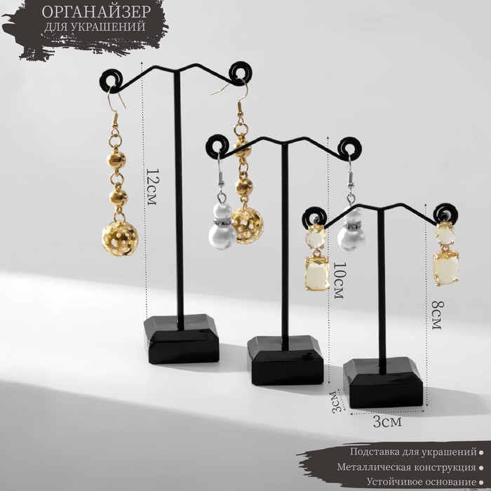 Если вы занимаетесь реализацией разнообразных украшений и аксессуаров, то вам нужно наглядно продемонстрировать свой товар, представив его в лучшем виде. Подставка под серьги Queen fair «Акрил», набор 3 шт, h=8, 10, 12 см, цвет чёрный как нельзя лучше справится с этой задачей! У каждого украшения появится своё место, откуда его можно будет хорошо рассмотреть.