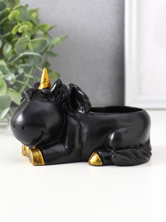 Эта подставка в форме единорога — стильное и практичное решение для хранения мелочей в любом помещении. Выполненная из гипса и покрытая чёрной краской, она привносит в интерьер нотку загадочности и элегантности, при этом оставаясь функциональным аксессуаром.