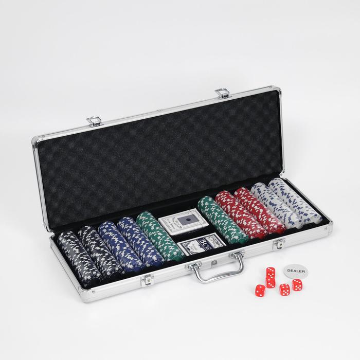 Покер в металлическом кейсе (2 колоды, фишки 500 шт. б/номинала, 5 кубиков), 20,5×56 см