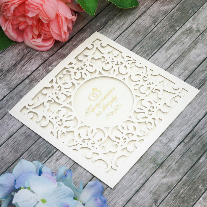 Когда дата и время бракосочетания уже известны, и вы определились со списком гостей, необходимо оповестить их о предстоящем празднике. Существует традиция делать персональные приглашения с указанием времени и даты мероприятия. Но перед свадьбой столько всего надо успеть, что на изготовление десятков открыток просто не остаётся времени. В этом случае вам придёт на помощь уникальное приглашение. Конверт выполнен из жемчужной бумаги плотностью 250 грамм, вкладыш из офисной бумаги 120 грамм. Это придаёт дорогой и роскошный вид. Текст приглашения содержит свободные поля для имени адресата, времени, даты и адреса проведения мероприятия. Это потрясающее приглашение достойно стать частью такого важного события в жизни, как свадьба!