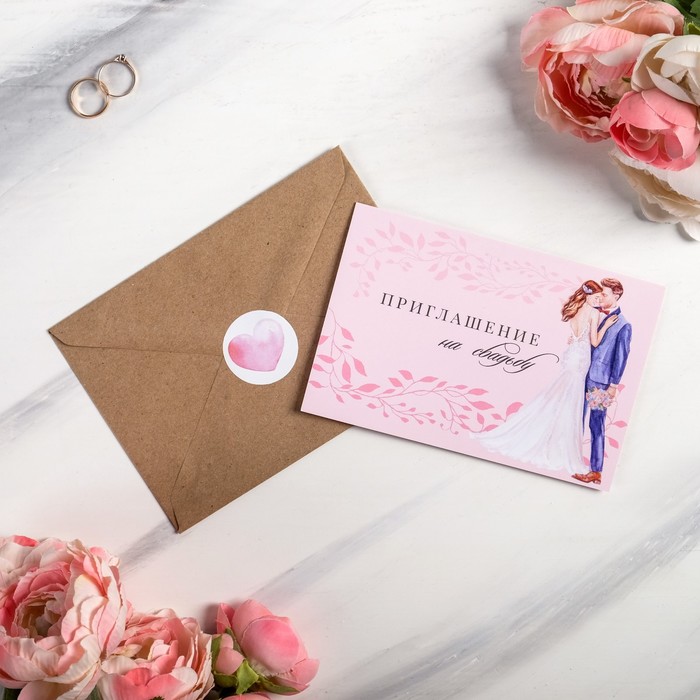 Когда дата и время бракосочетания уже известны, и вы определились со списком гостей, необходимо оповестить их о предстоящем празднике. Существует традиция делать персональные приглашения с указанием времени и даты мероприятия. Но перед свадьбой столько всего надо успеть, что на изготовление десятков открыток просто не остаётся времени. В этом случае вам придёт на помощь уникальное приглашение. Изделие выполнено из картона плотностью 250 грамм и дополненено крафтовым конвертом с наклейкой из самоклеющейся бумаги.. Это придаёт дорогой и роскошный вид. Текст приглашения содержит свободные поля для имени адресата, времени, даты и адреса проведения мероприятия. Это потрясающее приглашение достойно стать частью такого важного события в жизни, как свадьба!