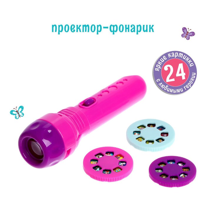 В набор входят: проектор-фонарик и 3 колёсика со слайдами (24 цветных картинки).