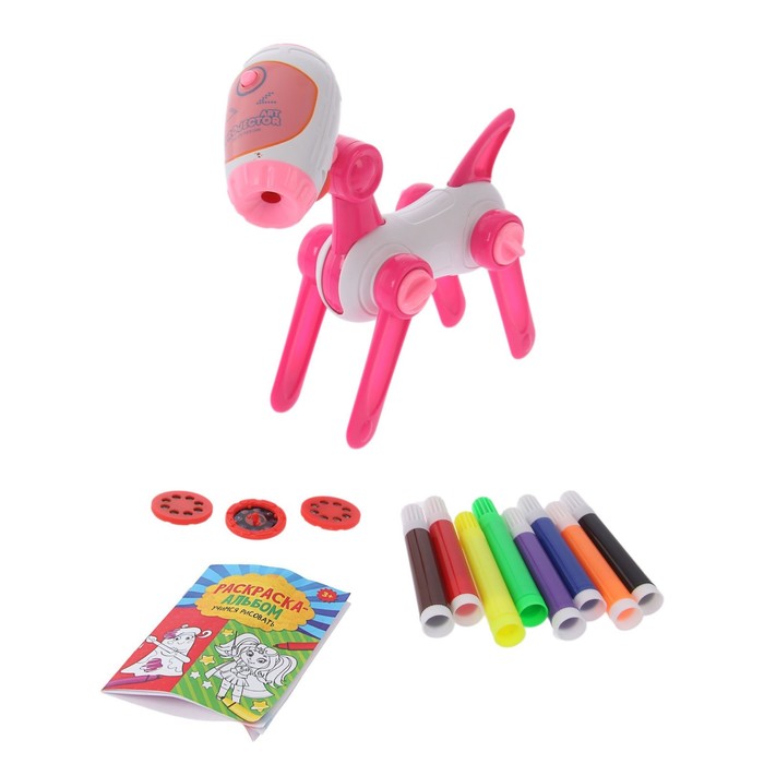 Данная игрушка — это проектор-лампа. Чтобы начать с ней работу, необходимо вставить в устройство 3 батарейки типа AG13 (входят в комплект), затем установить один из четырёх слайдов. Прибор перенесёт изображение на лист бумаги, а малыш с удовольствием раскрасит полученную картинку.