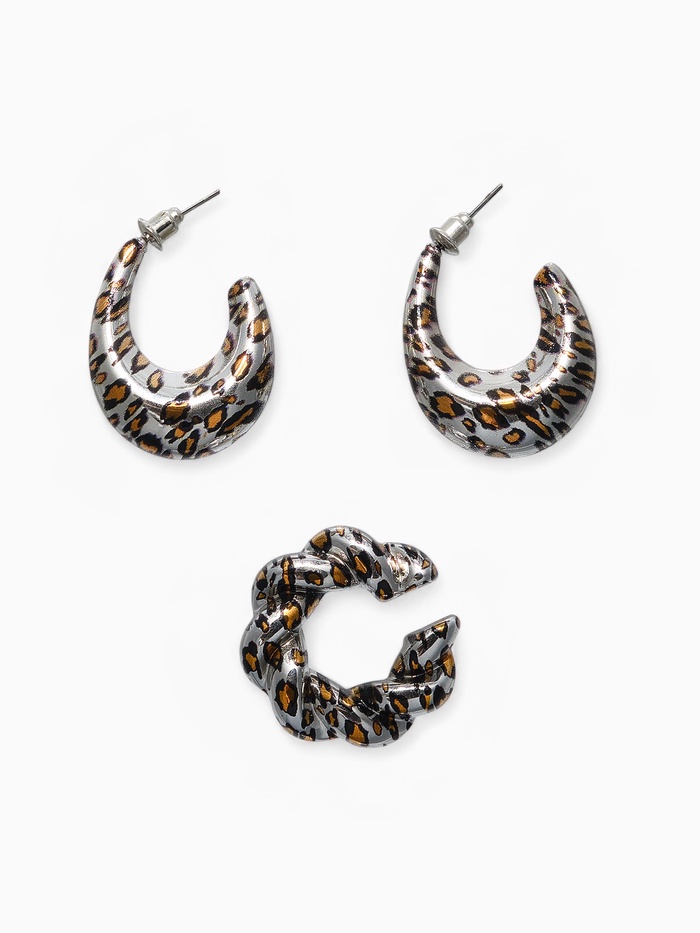 Серебристый комплект серьги и каффы с леопардовым жгутиком — это гармоничное сочетание изящества и дерзкой природной энергии. Изделия из лёгкого пластика с серебристым покрытием создают эффект благородного блеска, подчёркивая индивидуальность и современный стиль каждой женщины.