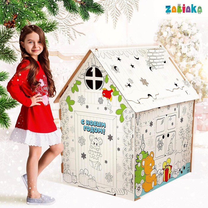 Новогодний домик из картона станет отличным подарком для ребёнка и любимым местом для его игр. Внутри малыш устроит себе уютный уголок, а снаружи раскрасит стены по собственному вкусу.