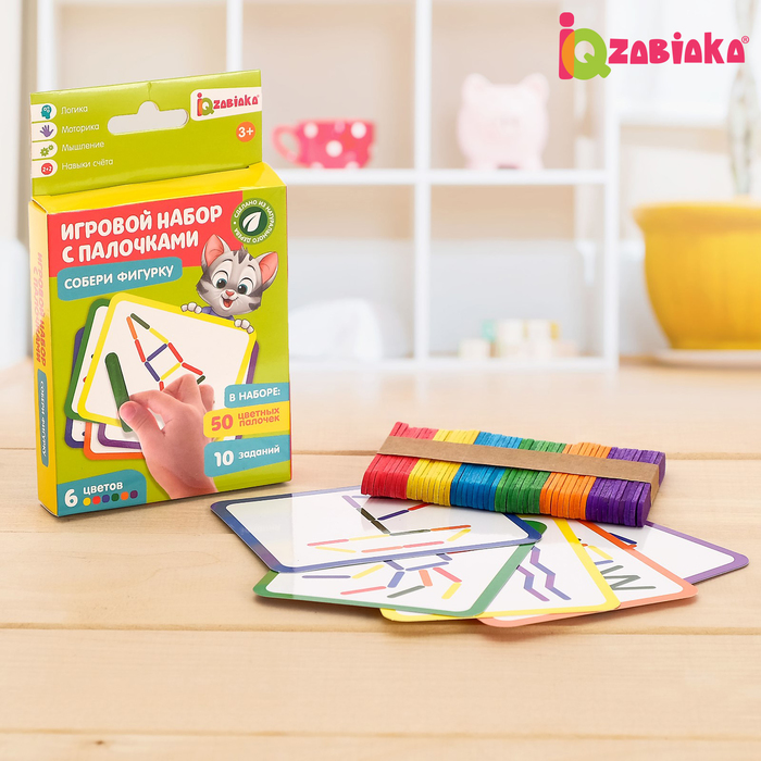 Обучающий набор «Собери фигурку» подходит для малышей от 3 лет. Он включает деревянные палочки и карточки-схемы. Палочки выполнены из натурального дерева, приятны на ощупь и абсолютно безопасны для ребёнка!