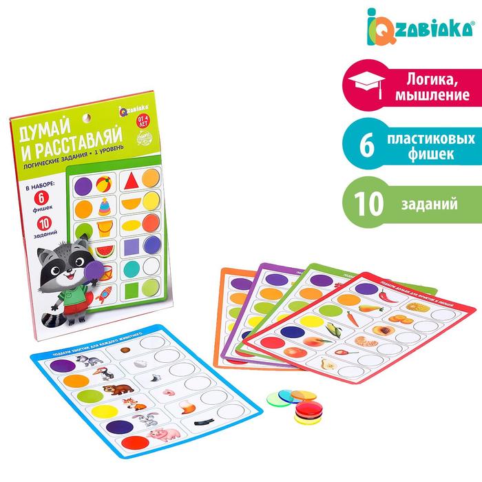 Набор «Думай и расставляй» (1-й уровень) поможет малышу решать задачки с цветными фишками, подбирать логические пары.