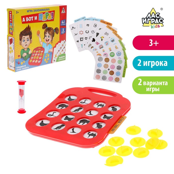 В наборе вы найдёте красный планшет из качественного пластика и 10 двусторонних карточек из толстого картона. На каждой карточке изображены картинки, у каждой из которых есть точная копия: то есть все картинки парные. Выберите одну из карточек, вставьте её в планшет, а все картинки закройте жёлтыми колпачками. Далее игроки по очереди открывают по 2 колпачка за раз. если под ними оказались одинаковые картинки – колпачки нужно взять себе и сделать ещё один ход, если разные – колпачки нужно вернуть на место и передать ход сопернику.
