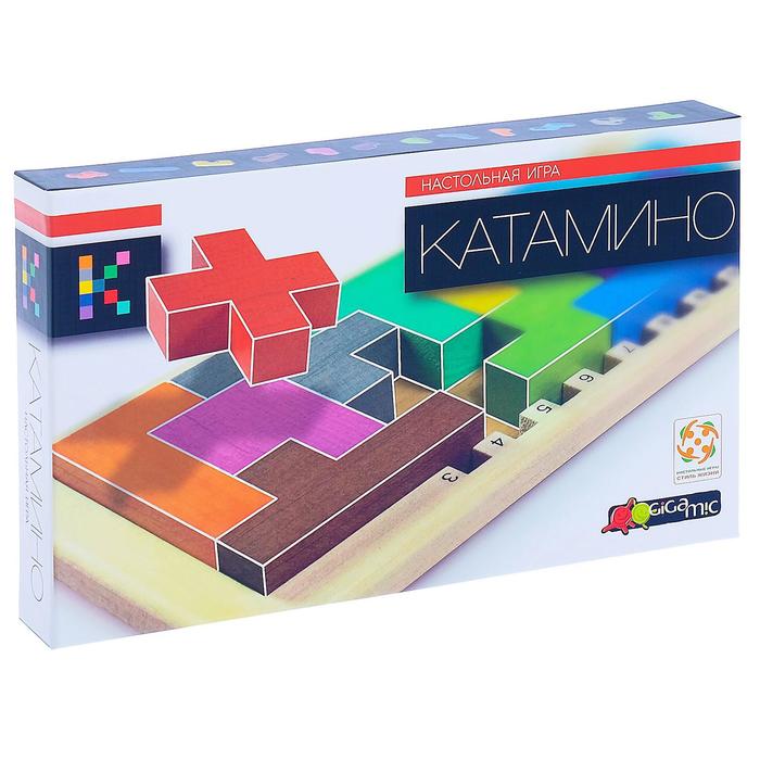 В состав настольной игры Катмино входит: 12 пентамино, 5 красных кубиков, 3 коричневых кубика, 1 игровое поле, 1 барьер. Время игры: 5-45 мин Мин. возраст: от 3 лет Кол-во игроков: 1-2