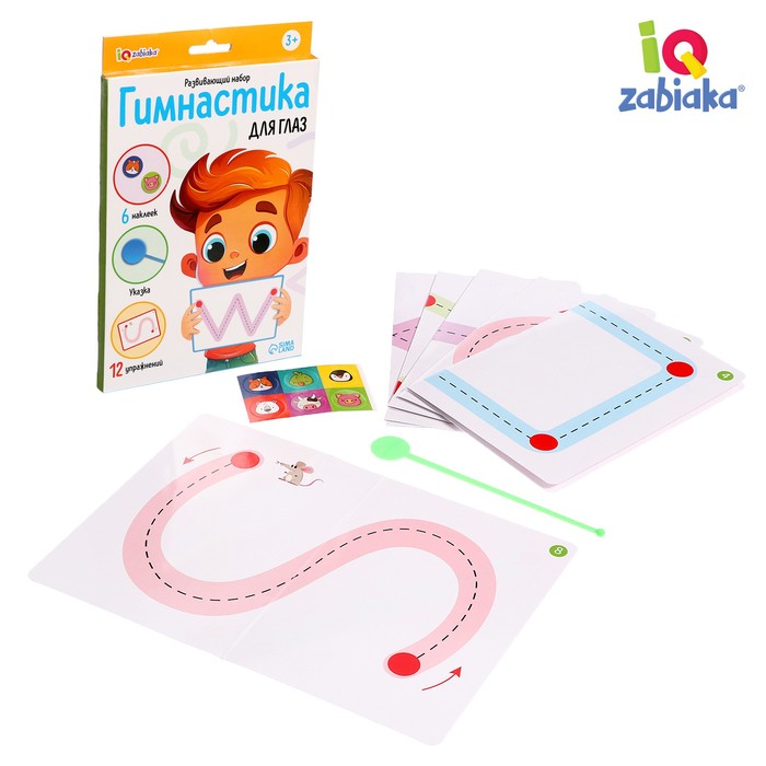 Развивающий набор «Гимнастика для глаз» — развивающий набор для детей от 3 лет. Ребёнка ждут увлекательные упражнения и милые наклейки с животными. Такое приобретение поможет снять напряжение с глаз, улучшить кровообращение и повысить остроту зрения.