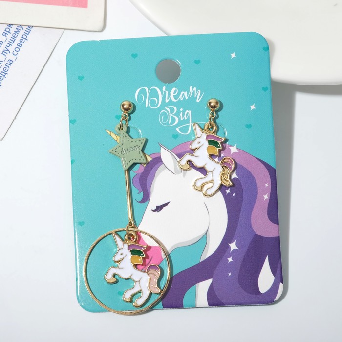Серьги эмаль «Фантазия» звезда и единорог, цвет бело-розовый в золоте