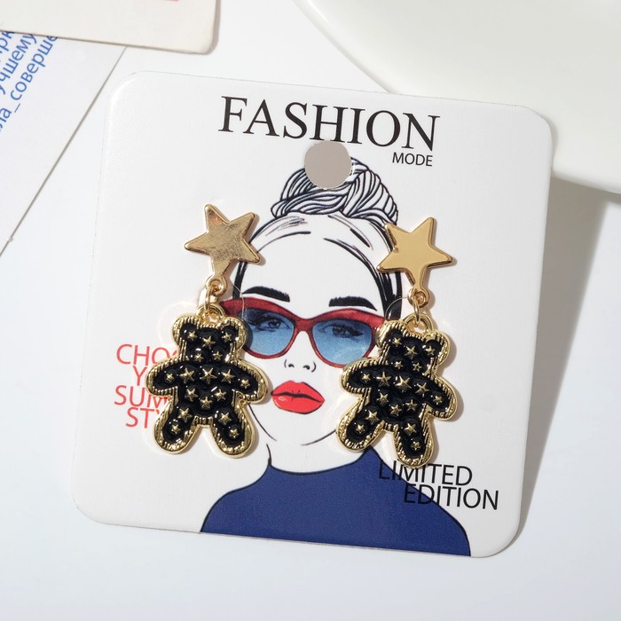 Серьги с эмалью «Печенье» мишки и звёздочки, цвет чёрный в золоте