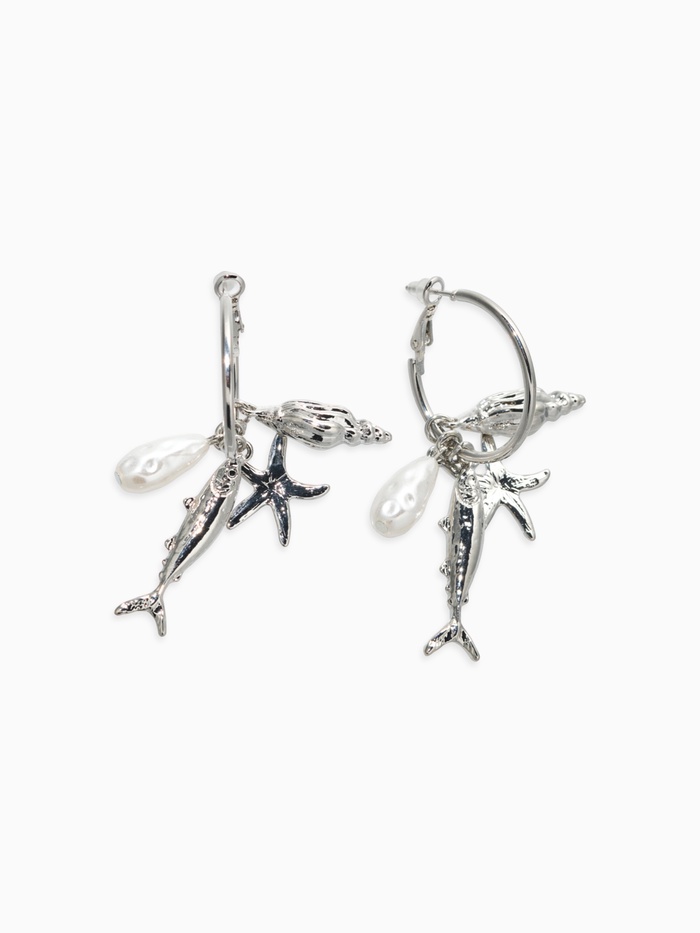 Серебристые серьги с подвесками в морском стиле дарят образу лёгкость и изысканность, вдохновляя на мечты о тёплых прибрежных прогулках. Белые пластиковые вставки тонко играют с оттенками серебристого, создавая впечатление света и глубины, словно солнечные блики на поверхности воды.