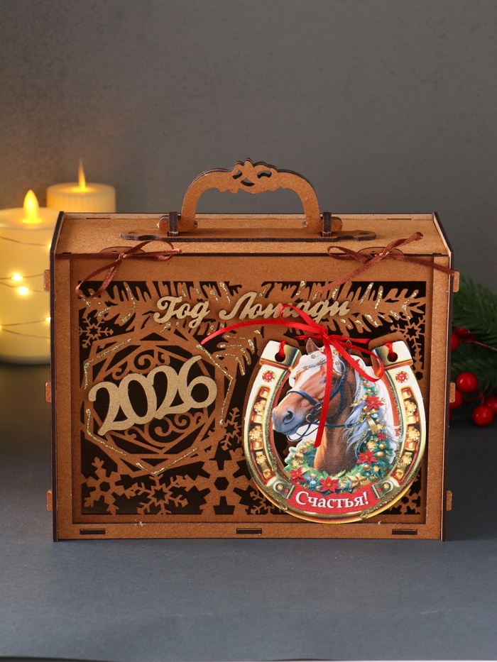 Эта деревянная шкатулка, выполненная из высококачественного МДФ с изящным коричневым покрытием, воплощает атмосферу наступающего Нового года и символизирует Год Лошади по восточному календарю. Её прямоугольная форма и продуманные размеры 23×18×10,5 см делают изделие удобным для хранения различных мелочей, а ручка обеспечивает комфортное перемещение и использование.