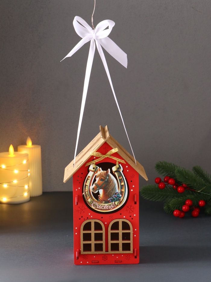 Позвольте себе заглянуть в уютный мир праздничного чуда, воплощенный в изящных линиях этого новогоднего домика. Глубокий красный цвет, традиционный для самого волшебного времени года, сразу создаёт ощущение тепла и предвкушения праздника. Это не просто шкатулка, а миниатюрное хранилище самых ценных моментов и сокровенных желаний, где каждая деталь продумана до мелочей — от искусно выполненных окон до фигурки символа наступающего года, изящной лошади, встречающей вас у входа.