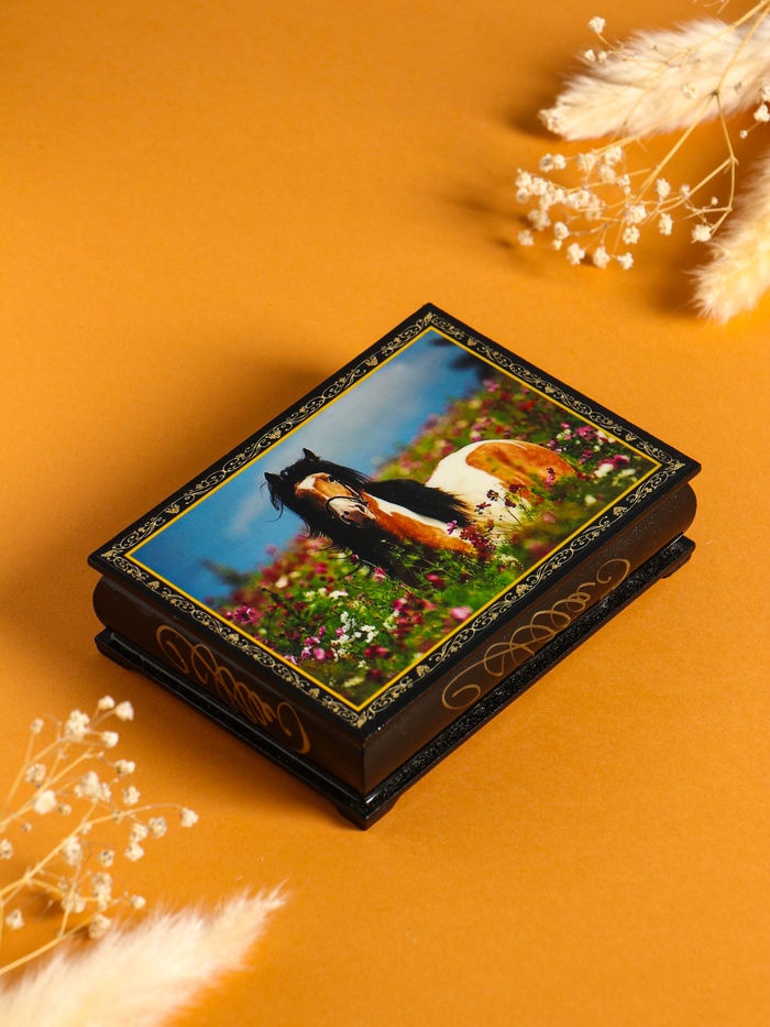 Храните драгоценности в шкатулке с историей! Лаковая шкатулка «Конь на лугу» — это произведение искусства, созданное для хранения ваших украшений.