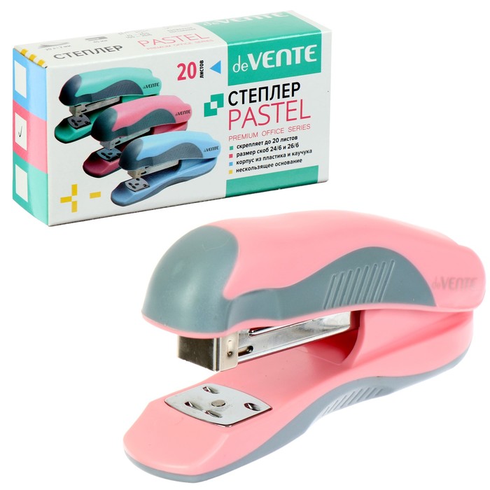 Степлер "deVENTE. Pastel" 24/6&26/6 (мощность 20 листов, глубина скрепления 45 мм) пластиковый с каучуковой вставкой, в картонной коробке, 3 пастельных цвета ассорти.