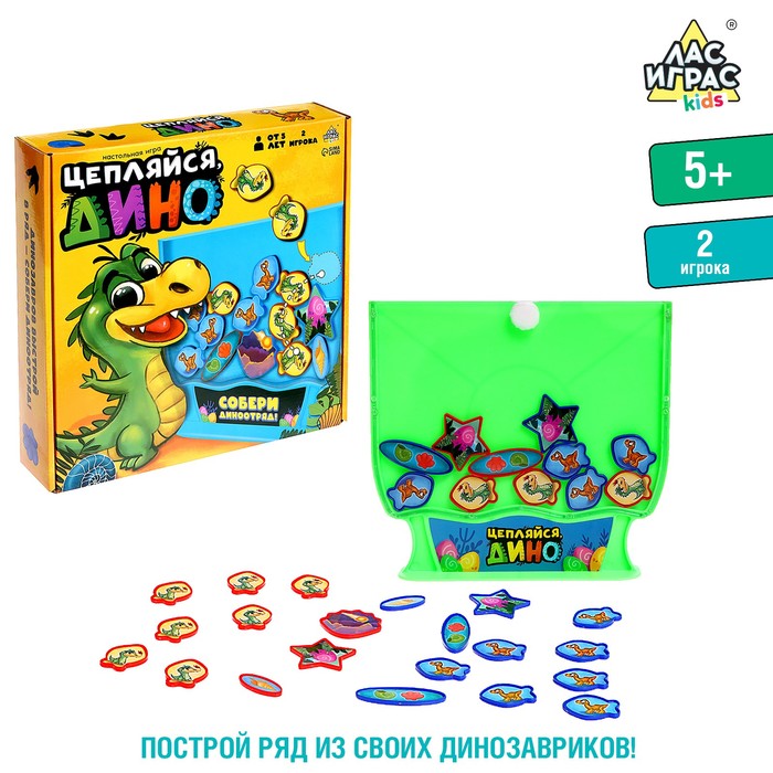 Настольная игра «Цепляйся, Дино» рекомендована для детей от 5 лет. Рассчитана на 2 игроков.