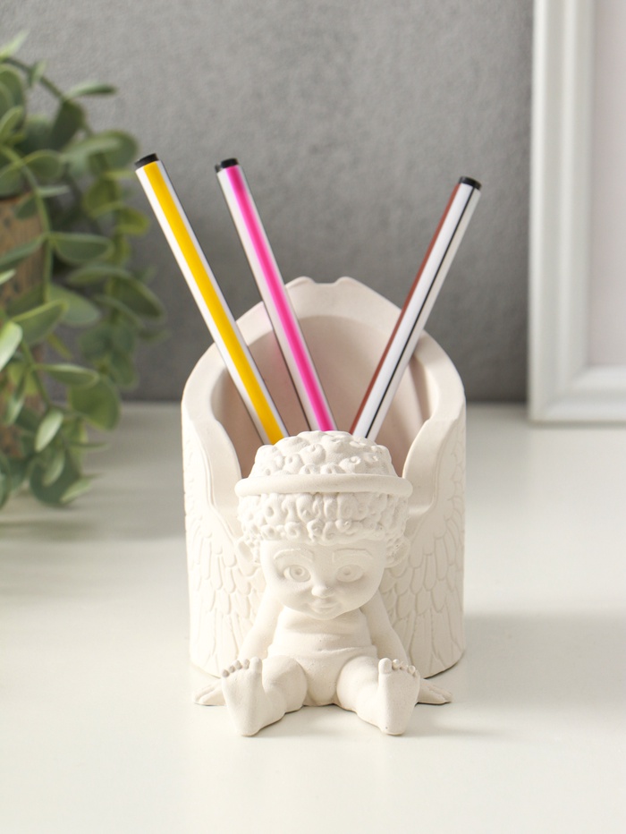Эта гипсовая подставка для карандашей в виде ангела станет тихим напоминанием о прекрасном на рабочем столе или в домашнем кабинете. Её лаконичная форма и чисто белый цвет создают атмосферу спокойствия и порядка, превращая обычные письменные принадлежности в элемент интерьера. Место для ручек и карандашей органично вписано в дизайн, делая этот предмет одновременно декоративным и практичным.