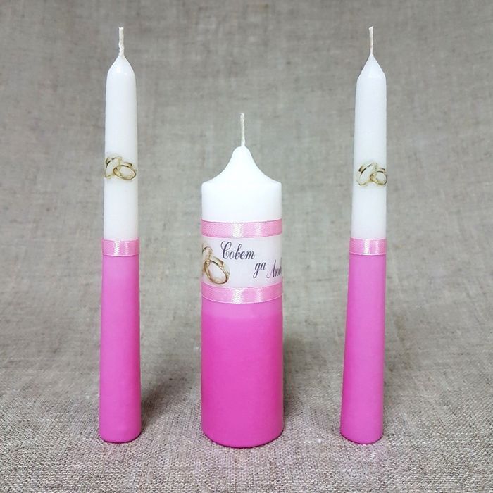Композиция включает две стройные родительские свечи высотой 17,5 см и одну более массивную свечу-очаг высотой 13,5 см. Их классическая цилиндрическая форма и благородный розовый цвет идеально впишутся в любую свадебную стилистику, добавляя церемонии торжественности и романтики.