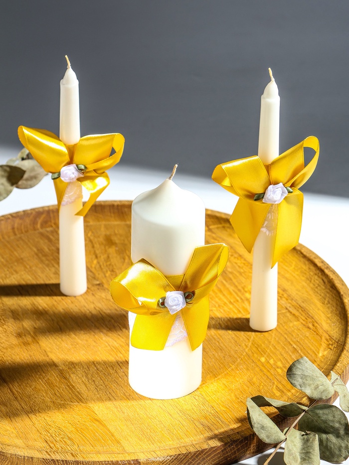 Исполненные из качественного парафина, эти свечи горят ровно и продолжительно, символизируя прочность семейных уз. Их классическое бело-золотое сочетание гармонично впишется в любую свадебную палитру — от роскошной до минималистичной, добавляя церемонии элегантности и завершённости.