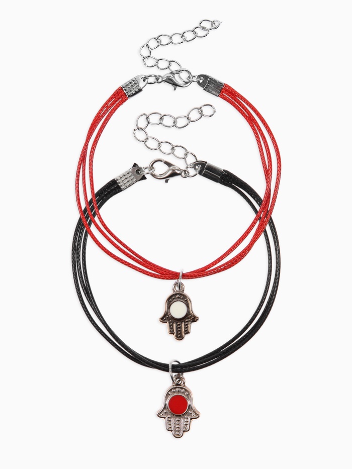 Парные браслеты «Неразлучники» — это не просто аксессуар, а символ тесной связи и взаимной поддержки. Черный и красный текстильные ремешки увенчаны подвесками в виде магической Руки Хамса, олицетворяющей защиту и удачу.