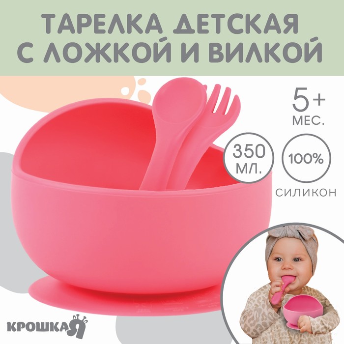 Тарелка на присоске и столовые приборы Крошка Я, из силикона, розовый