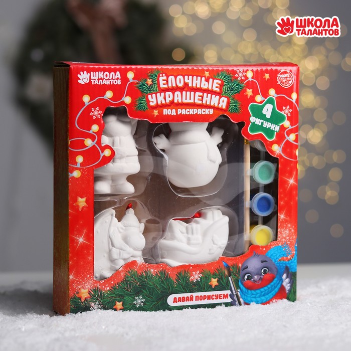 Набор ёлочных украшений под раскраску 4 шт. «Волшебный» с подвесом, краска 6 цв по 2 мл, кисть