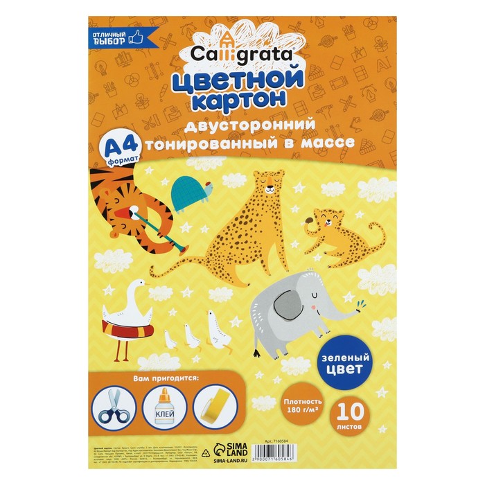 Картон цветной двусторонний А4, тонированный в массе, 10 листов, 180 г/м2, зелёный