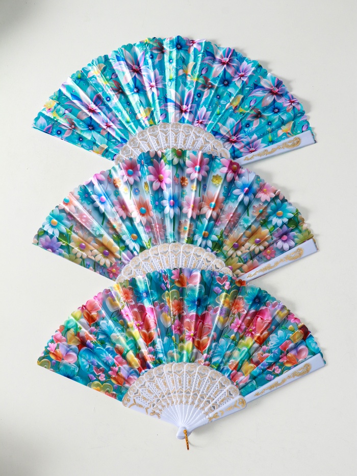 Этот складной веер с широкими лопастями — лёгкое спасение от летнего зноя. Он раскрывается одним движением, создавая приятный поток воздуха. Узор из ярких цветов и листьев напоминает о цветущем саду, добавляя образу изящный акцент.