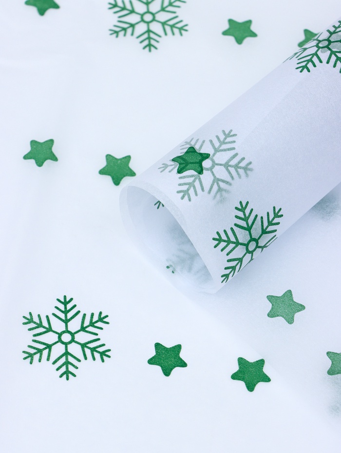 Классическое зимнее настроение! Бумага упаковочная тишью «Снежинки со звездами», зелёная, 50×66 см — это праздничный материал в традиционной новогодней гамме. Зеленый фон с зимним узором создает атмосферу уютного праздника.