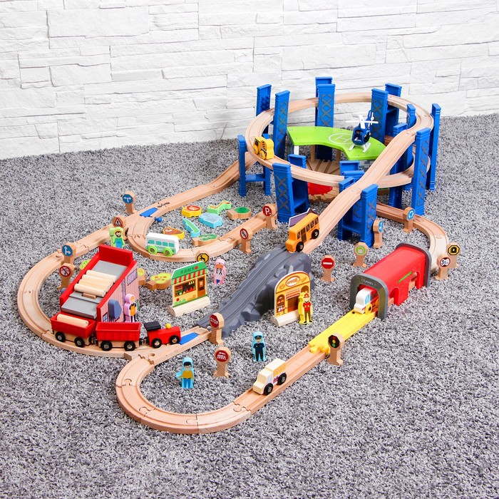 Железная дорога — это красочный набор для сюжетных игр. Большое количество декораций и фигурок позволяет собрать действующий комплекс с транспортной развязкой. Дорожное полотно можно укладывать на уровень выше основного положения рельсов, чтобы организовать многоуровневые съезды и мосты.