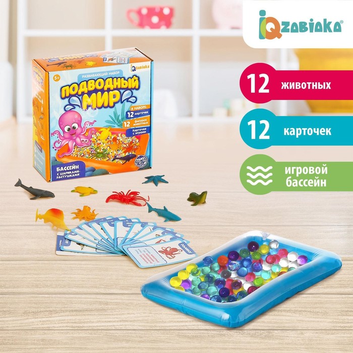 Набор состоит из надувного бассейна и фигурки рыбок, моржей, морских котиков и других морских обитателей. А чтобы малышу было интереснее знакомиться с ними, в комплекте есть цветные карточки с описанием животных.